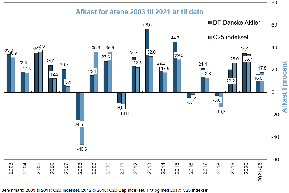 Nedenfor vises de aktuelle afkast Dansk Finansservice Danske Aktier har opnået siden 2003 (pr. ultimo august 2021).