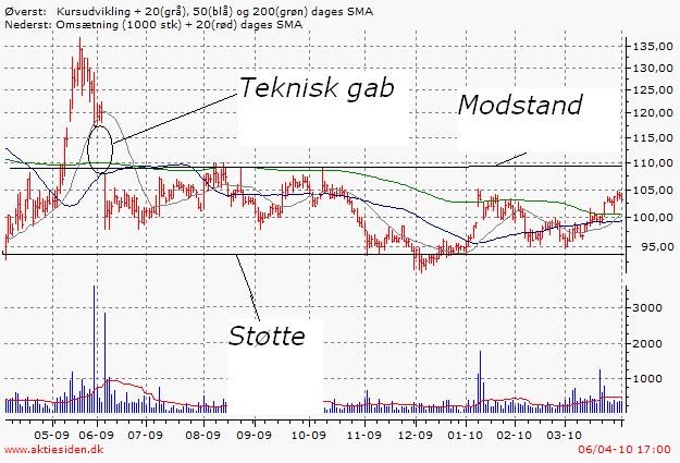 Et gab opstår når kursdannelsen ”springer et led over”. Altså hvis en aktie på en dårlig nyhed falder mere eller mindre uden handel fra fx 120 til 100. Der er så et gap fra 120 til 100. Gaps bliver normalt altid lukket, og derfor er der grund til at tro, at vi trods et markant kursfald fra 120 til 100 alligevel før eller siden ser kursen stige til 120. Prøv at følge udviklingen i nedennævnte chart, og bemærk at alle gaps er blevet lukket. Ingen regel uden undtagelser, og tro ikke at denne regel er 100% sikker.