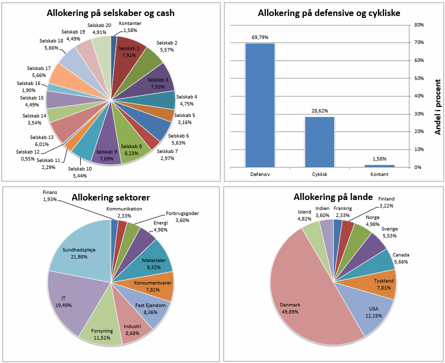 Du kan downloade de første sider af planen via dette link, hvilket vil give dig et lille indblik i de mange fordele, som du opnår ved at købe planen, herunder en liste over Jesper Lunds aktuelle porteføljesammensætning. Når du køber Dansk Finansservice Porteføljeplan medfølger et Excel-regneark til porteføljestyring. Figuren nedenfor illustrerer de grafer som automatisk genereres i Excel. Bemærk: Du kan ikke sidestille de afkast, som Jesper Lund opnår, med de afkast du måtte opnå, da det afhænger af en række variabler, som DU selv lægger til grund for DIN portefølje.